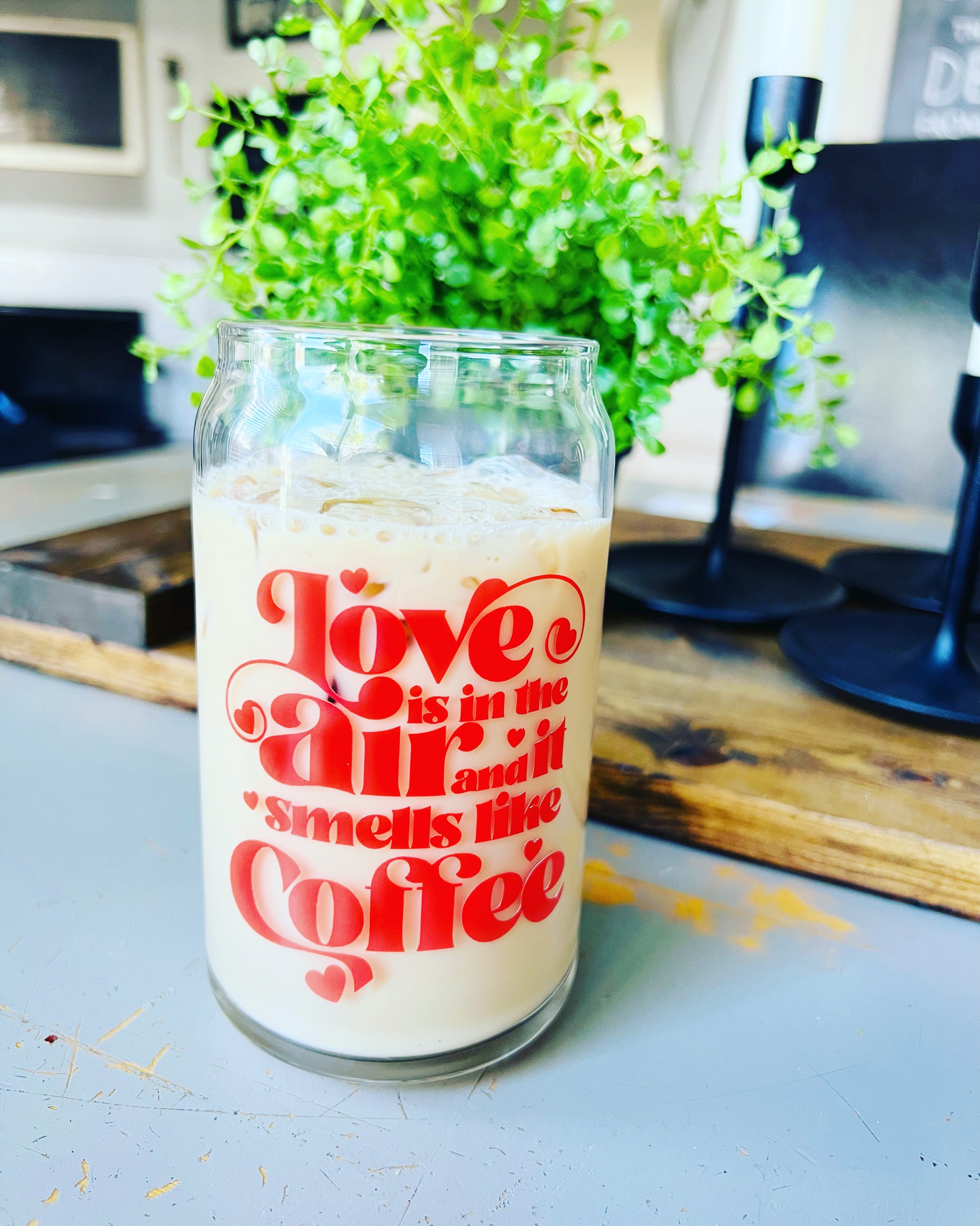 Love is in the air and it smells like coffee. Valentine’s day Libbey can glass. beer can glass. iced coffee glass. Valentine’s day gift